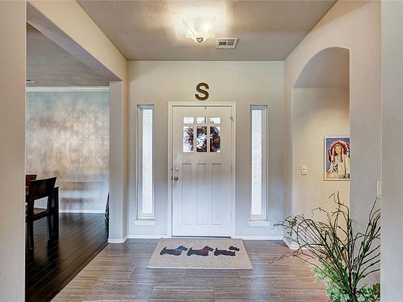 Located in highly desirable Arbor Creek, & within minutes of I-35 access, downtown Edmond, & Arcadia Lake, you will find this home is in a great location! The exterior of this Craftsman Bungalow features charming front porch w/cozy swing, landscaped garden beds, & spacious yard. The interior offers sleek contemporary design, stylish fixtures & hardware, modern accents, & open concept. The liv. room features vaulted ceiling, grand fireplace, & built-in sound & enter. center. The kitchen hosts modern backsplash, double islands, pantry, built-in family style seating, & built-in hutch. Formal dining offers built-in hutch, rich hardwood floors, designer lighting & accent wall. The home offers flex room off the kitchen, perfect as a study/game room/4th bed. Spacious master suite features dual vanities, spa tub, & walk-in shower w/frameless glass door. Oversized utility, perfect for second fridge/extra storage. Storm shelter! Hall tree at garage entry! Community greenbelt across the street!