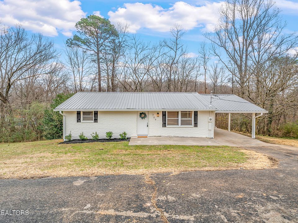The home has been thoughtfully updated throughout, including a new metal roof, full brick exterior, newly painted exterior, new deck, newer HVAC, newer vinyl windows, new exterior doors, and fresh landscaping. A one-car carport adds everyday convenience.