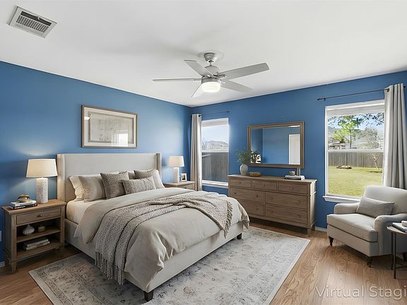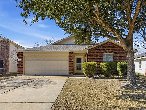Welcome to 709 Lavaca Loop, a well-maintained single-story home designed for easy living and flexible use. This thoughtfully laid-out Mother-In-Law floorplan offers the secondary bedrooms and full bath at the front of the home, making it ideal for multigenerational living. The open-concept kitchen, dining, and living areas create a light and airy feel, perfect for both everyday living and entertaining. Stainless steel appliances, including the refrigerator, convey with the home. With no carpet throughout, the space is easy to maintain and allergy-friendly. Step outside to enjoy the covered back porch overlooking a spacious, shady backyard. A detached bonus shed complete with power and A/C, offers endless possibilities as a she-shed, man cave, home office, studio, gym or hobby space. Located in a welcoming neighborhood with a playground, basketball courts, and walking trails, this home is a great fit for first-time buyers, growing families, investors or anyone looking to downsize without sacrificing comfort or versatility.
