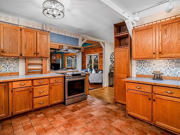 - Features: Wood / Coal / Pellet Stove, Skylight, Ceiling Fan(s), Beamed Ceilings, Flooring - Hardwood, Flooring - Stone/Ceramic Tile, Deck - Exterior, Exterior Access, Slider, Lighting - Overhead, Half Vaulted Ceiling(s), Window Seat