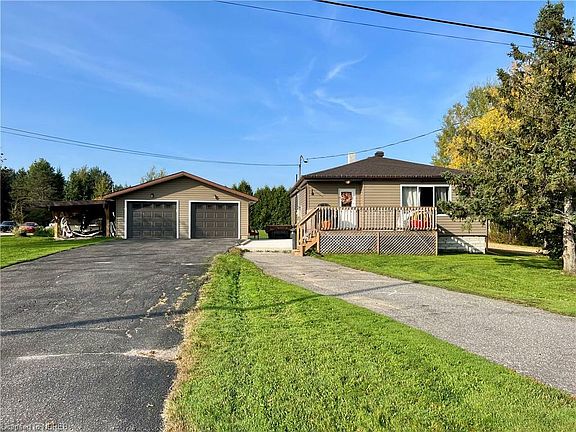 Welcome to the heated garage of your dreams! We are talking an oversized double detached garage, can park your large pick up truck and a boat, or use as a heated workshop with the 2021 gas heated, finished interior with 100 amp power... 2 modern garage doors installed in 2021 with auto door openers and remotes.. and it even has a newly added covered lean-to that is 12 ft x 36 ft perfect for storing any extra outdoor toys from the elements. Alright, now for the ladies... let's get to the features of the home shall we? This bungalow has been renovated from top to bottom and features 3 bedrooms and a full bath on one level, an open concept living room/ dining and kitchen with a newer appliance package. The lower level features a large finished family room and a spare bedroom. There is an oversized unfinished storage/utility and laundry room as well. The side entrance of the home leads you to a 2023 poured concrete pad which houses a hot tub between the home and the detached garage. Behind both buildings, you will see a very large green backyard complete with mature cedars at the rear of the property, giving you the privacy from the neighbours. Fencing on both sides of the backyard would complete your private oasis right in the hometown of Powassan, ON, close to all amenities and a short 15 min. drive South of North Bay.