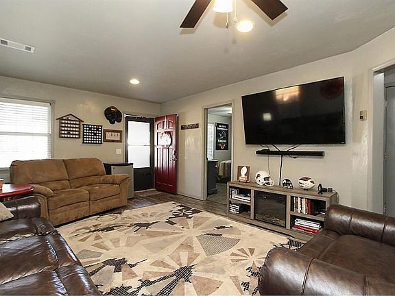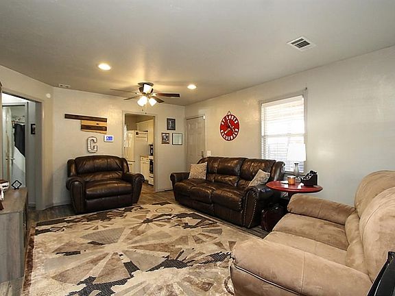 This cute home has 2 bedrooms and 1 bathroom in the heart of Blanchard. Home features a concrete pad for parking with steel frame carport as well as a detached 24x30 garage accessible from the alley. The detached garage has new siding, garage door opener, and metal roof. Nice sized backyard with a fully fenced yard and gate. There is also a covered patio, perfect for relaxing outdoors, that has a door to access the living area and gate to enter under the carport. This home has a metal roof with guttering, newer windows, storm doors for both exterior doors, and newer siding. Inside there is vinyl flooring in main areas and carpet and ceiling fans in the bedrooms, 2-inch blinds throughout, inside utility room, gas range stove in the kitchen, built in microwave, and refrigerator will stay with the home. The primary bedroom has a nice sized walk-in closet and built ins. There is also a linen closet in the hallway and hanging area for clothes in the laundry room that is conveniently located between both bedrooms. Home has ADT monitored security system. You don't want to miss seeing this one! Great for an investment property, first time home buyer, or small family. Move in ready!