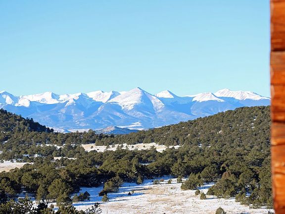 4 BD 2BA custom log home is situated on 56+/- acres bordering BLM. Jaw dropping views of the Sangre De Cristo Mountains are enjoyed through large windows and wrap around deck. Kitchen has recently been remodeled with granite counter tops. Spectacular floor to ceiling stone fireplace with a high efficiency insert in conjunction with the roof's 8 inch foam insulation and 12" dia. logs results in a home that is easy on the pocket book for heating bills. Attached 2 car garage and a 36'x36' barn and round pen. Property in a tranquil setting is beautifully treed with Ponderosa, Spruce, and Pinion. Property is fenced and in a gated community- yet no POA. Located 30 minutes from Canon City or Westcliffe. Home Warranty is offered. Owner is a licensed Colorado Realtor.
