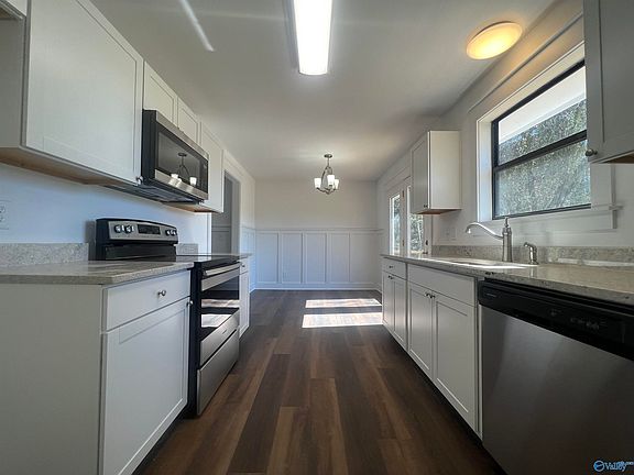 Updating has just been completed on this charming 4 bedroom, 3 bath ranch style home with a detached 24'X36' garage/workshop, all located on almost 3/4-acre lot. This home has undergone a full remodel including the following upgrades and improvements: new kitchen cabinetry and granite countertops, new flooring, new roof, fresh interior and exterior paint, custom craftsman trim package, new back deck, new kitchen appliances, and much more. Being located between Albertville and Guntersville, allows convenient access to shopping, restaurants, hospital, and only a 10-minute drive to the public boat launch on Lake Guntersville.