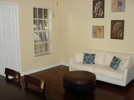 Elegant is an understatement for this upgraded Cobblestone Townhome. Appointed with luxurious Kempas Royal Hardwood floors downstairs, crown molding throughout & Carpet in the master and Jr. Master suite with built out closets in each. For convenience, the washer and dryer is upstairs. The Kitchen has Granite Counter tops, stainless steel appliances and wood cabinets. The flooring in the kitchen is tile. There is plenty of guest parking and the pool is just a minute away.