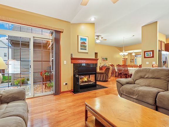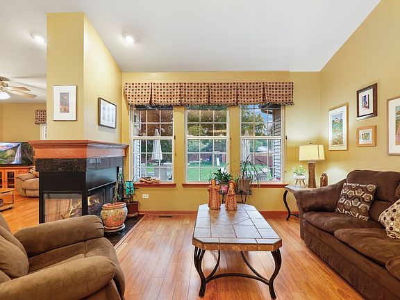 Stair-free living awaits in this stunning ranch home in desirable Silver Leaf of Joliet! An inviting entry leads into the well-appointed floor plan with high vaulted ceilings, gorgeous wood-laminate floors, large windows and open concept living. Entertain with ease in the spacious living and dining rooms, anchored by a timeless and cozy 3-sided fireplace. Enjoy meals in the eat-in kitchen with granite counters, tiled backsplash, stainless steel appliances, large island and generous dinette area. The sunny family room is the perfect place to gather with convenient access to the backyard. Retreat at day's end to the tranquil owner's suite with walk-in closet and private bath. 2 additional bedrooms, a hall bath and laundry room complete the main level. The finished basement provides even more great living space with a rec room, 4th bedroom and another full bath. Outside, relax on the stamped concrete patio overlooking the massive fenced yard with mature trees, lush landscaping and shed. Great location, close to schools, dining, shopping, hospitals, interstate access and more. A preferred lender offers a reduced interest rate for this listing. Move in and start making memories!