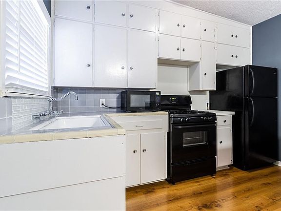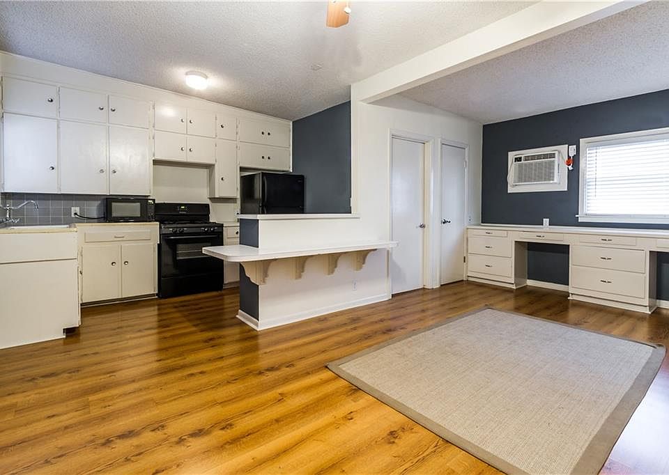 Retro-Contemporary flat with lots of kitchen cabinetry and storage space. Perfect for someone with minimal furniture; built-ins replace the kitchen table, shelving, tv stand, desk and vanity! Wood flooring or carpet throughout and 2 closets. Pool, lounging and 1 parking spot. Walk to Rio Rancho taco trucks hangout. Cats only. Water, sewer, trash included! You pay electric and gas. Sorry No Dogs. 12 month lease minimum. Pictures are an example. Colors may vary.