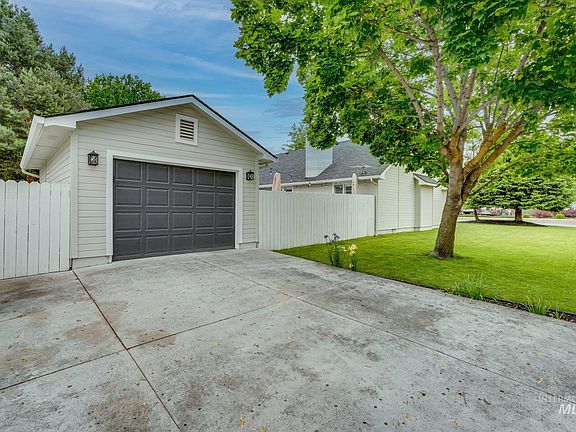 This single level home includes a detached 3rd bay garage/shop & recently remodeled from top to bottom, inside & out, with the highest quality finishes & attention to every last detail, a rare find. The open floorplan with soaring ceilings opens the great room looking out from the wall of windows to the private, lush backyard, complete with patio & trex decking. This .21 acre, corner lot in a cul de sac offers a secluded respite, just minutes to downtown Eagle & the river. Stunning kitchen features an entertainer's island, elegant granite & tilework, pantry w/appliance counter, & high-end appliances w/fridge included. Charming upgrades warm the home with granite surrounding fireplace, plantation shutters, wide plank luxury flooring, designer tile, modern black matte fixtures, & water filtration system. Flexible layout offers open formal & informal dining nook with built-in benches. Spa like master w/walk-in shower, walk-in closet, & dual vanities. Guest parking area included in HOA.