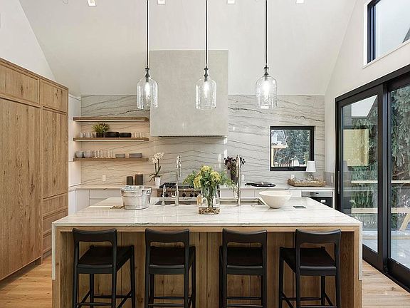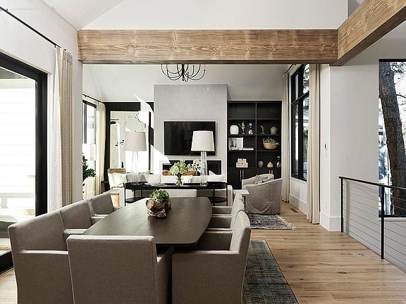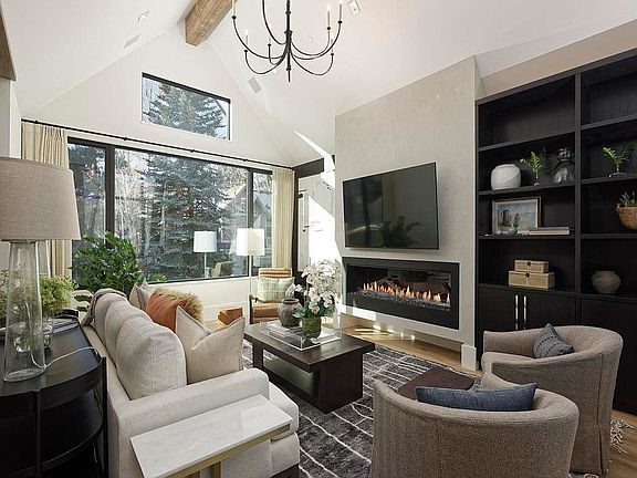 Own one-eighth of this professionally managed, turnkey home. With rooflines that echo the nearby peaks, this impeccably remodeled Aspen home has vaulted ceilings with grand views of Shadow Mountain. An open floor plan and seamless indoor-outdoor living create an idyllic mountain retreat. Warm, wide-plank wood floors and box beams provide a contrast to the iron banisters of the open staircase and black-framed windows and exterior doors. Stone is used throughout the interior, including a sleek wet bar at the top of the stairs. Just past the bar is the main living space, sophisticated dining area and gorgeous gourmet kitchen. The kitchen has top-of-the-line appliances, a striking stone backsplash wall and matching waterfall-edge islands. The kitchen and dining room doors lead to an outdoor entertaining space. The primary bedroom features an en suite bathroom that’s nothing short of luxurious, with two vanities, a soaking tub and glass-enclosed steam shower. The guest bedrooms and bathrooms are beautifully appointed, and a private office is the perfect place to read or work.