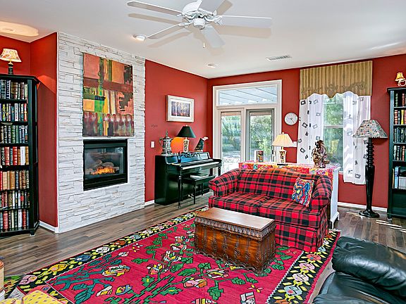 StoneRidge Bungalow Dorado Plan with Mountain Views & Custom Upgrades Throughout! Single Level, 1697 SqFt, 3BD + 2BA/2 Car Garage, .22 Acre Lot. Great Location overlooking the Golf Course, Clubhouse, Mountains & near the Restaurant! Welcoming Great Room has Stacked Stone Fireplace, Laminate Flooring, Ceiling Fan, Walls of Sunny Windows & French Doors to Rear Yard. Kitchen with Open Face Cabinetry, Built In Wine Rack, Mirrored Back-splash, Tiled Flooring, Open Dining Area, Appliances & Refrigerator Master Suite w/Custom Paint, Oval Bath, Clear Glass Step In Shower, Executive Height Marble Vanity with Dual Sinks, Lrg Walk In Closet & Private Toilet Rm. Scenic Pro Landscaped Yards with Mature Shade Trees & Plants, Drip Watering System, Covered Rear Patio & Covered Front Patio, Stacked