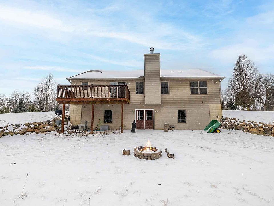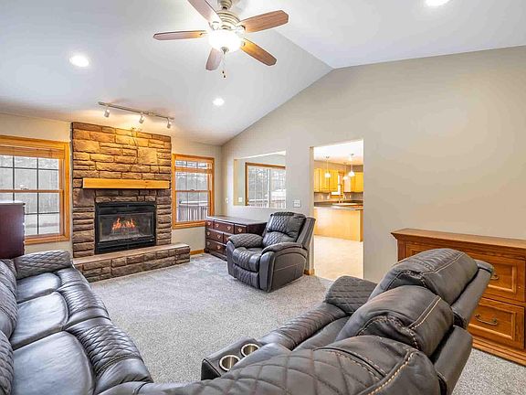 Nestled on over 2.28 acres, this beautiful ranch offers a serene retreat backing to lush woods, complete with a private pond with a fountain, perfect for swimming and fishing, plus a charming beach. The spacious kitchen is a chef's dream, featuring a large pantry, breakfast bar, new stainless steel appliances, and a dining area that opens to a second-story deck with sweeping views of the pond. The expansive great room is highlighted by soaring vaulted ceilings and a stunning fireplace framed by stacked stone and a rustic wooden beam mantle. On the main floor, you'll find three bedrooms, including a luxurious master suite with vaulted ceiling and an ensuite bathroom. Convenience is key with main floor laundry. The lower level is an entertainer's paradise or ideal in-law suite, complete with a large family room and space for a second kitchen, just waiting for your personal touch. French doors lead out to the beach, enhancing the indoor-outdoor living experience. Two additional bedrooms, both with oversized walk-in closets, plus a spacious bathroom with a low-threshold shower, as well as a storage room, round out this incredible lower level. Recent updates include newer mechanicals, ensuring peace of mind. Move right in and enjoy this one-of-a-kind property!
