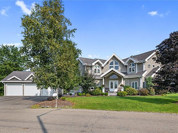 Gorgeous, massive contemporary home situated in private neighborhood of Bucks Meadow off of Bath Country Club! Enter this expansive home through the double story foyer to dramatic vaulted ceiling living room with floor to ceiling windows taking in the beautiful view. Large open kitchen is made for entertaining with dining area, and so much cabinet space. Two large first floor bedrooms, full bathroom, laundry finish the first floor. Upstairs the loft overlooks the lower level and leads to primary bedroom with balcony, walk in closet, ensuite bathroom. An additional large bedroom is upstairs. The lowest level is finished with two additional living room spaces, half bath and game room with full bar walking out to back yard. Huge detached 3 car garage! The amenities throughout the home and large spaces are hard to match! Come see for yourself!