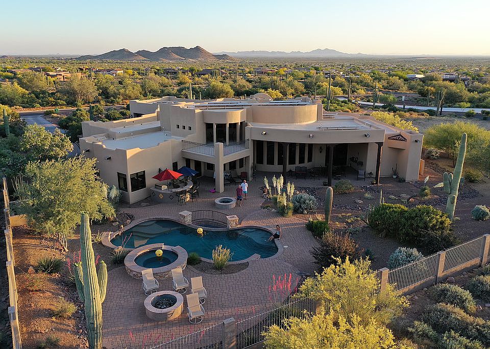 Saint Fe Custom built on the forest line of the Superstition Mountains. 4bd/5bath in main house with separate office, media room, and exercise room with 22 ft ceiling great room and dining room. 4 car garage with extra space for the man cave (or spare room) with bath and shower. Swimming pool and jacuzzi in large fenced backyard. Two indoor gas places, wet bar, and upstairs patio with indoor entrance to patio.