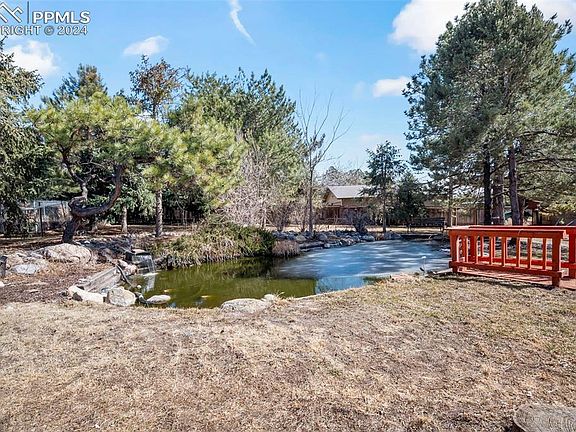 Hobbies. Home. Hosting. Hideaway. This is the property for you! Welcome to this charming, 1 acre, 4 bedroom, 3 bathroom home, with endless possibilities! Nestled on a peaceful suburban retreat, the property is located in the highly desirable Falcon Estates and within Academy School District 20 boundaries. Included in the property is a huge workshop/barn with sliding barn doors, 220v outlet, electricity, heat, and fence, making it a versatile space for many activities. Inside the front door, step into a great gathering room with luxury vinyl plank flooring throughout the home. The kitchen is a chef's delight with a kitchen island, quartz countertops, and curio style, soft-close cabinets. A bay window in the dining room creates a picturesque dining experience. The family room offers a cozy gas fireplace and built-in shelving. Perfect for relaxation, enjoy the serene sound of water from the covered patio in the back or take in the sunsets on the front porch. The outdoor space is adorned with a large pond featuring koi and goldfish, two storage sheds, RV parking, and more. Mature trees surround the property, providing shade and a sense of serenity. This home offers a perfect blend of comfort and convenience. Don't miss out on this suburban oasis and make this one a truly special place to call home. HOA dues are voluntary. All measurements are estimates. All information deemed reliable, but not guaranteed. Buyer to verify all.