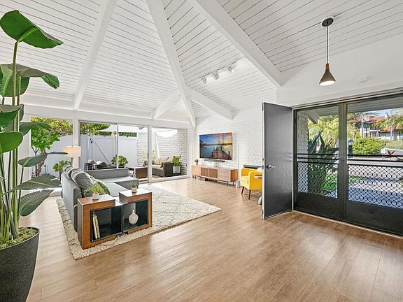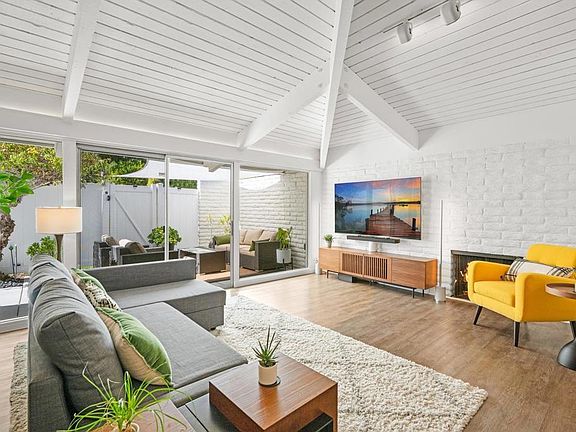 Discover the perfect blend of style, comfort, and convenience in this single story updated mid-century modern villa, ideally located just minutes from the Omni La Costa Resort and Carlsbad’s stunning coastline. Step inside and be captivated by soaring wood-finished ceilings, exposed brick walls, and an abundance of natural light. Tasteful upgrades throughout include a striking 1-inch wood panel accent wall in the living room, ambient cove lighting, and charming barn doors that open to a versatile home office/bedroom space. The spacious primary suite features a slider out to the patio, vaulted ceilings and a modern updated bathroom, creating your own peaceful sanctuary . The open floor plan seamlessly extends to the west-facing enclosed patio—redesigned for relaxation and the perfect place to unwind as you take in breathtaking sunsets. Additional highlights include indoor laundry and a one car garage. Residents also enjoy access to two community pools. With its prime location, architectural charm, and modern upgrades, this villa offers an exceptional opportunity to enjoy the best of coastal Carlsbad living.