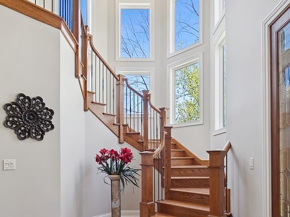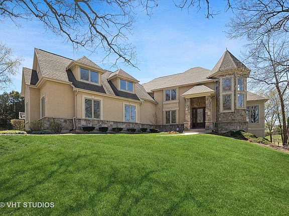 A wonderfully appointed home, designed for every day enjoyment and entertaining. Stamped cement walkway leads to the stately front door, opening to hardwood entry, the elegant turret, and the curved oak staircase. Dining room has wall to wall custom built-in buffet with cabinets. Following the flow of the home, is the private office with French door to outside deck. Livingroom is adorned by stone columns. Large walk-in pantry borders the incredible chefs kitchen. Custom granite island is so expansive that you can prepare a meal at one end and converse with friends seated at the other end. All newer stainless steel appliances complete with warming drawer. Work area is surrounded by loads of 42" maple cabinets, and tray ceiling. Along the wall is secretary desk with more cabinets. Work area opens to awesome eating area, windows all around with door to deck. Step around columns to luxurious relaxation in your family room with stone fireplace. Open space holds a convenient bar with refrigerator, sink, soda dispenser, cabinets and more. Next is the laundry room with many cabinets, and sink. There are two half baths on first floor, two staircases and heated floor. Lets follow stairs up to four great bedrooms. Luxurious primary bedroom with California closet, private bath, whirlpool soaking tub, plus shower, tray ceiling. Three additional bedrooms each have their own full bath, custom window seats with storage, flanked by desk and cabinets. Tray ceilings. Next is the ultimate in playrooms, exercise, workout rooms. Large windows, plenty of light. Whole house vac, for your convenience. Your weekend get-a-way is in your lower level. Full finished walk out basement, offers another bedroom. Full bath with steam shower, double heads. Huge open area for parties. Many windows with door to magnificent back yard. Tucked in one corner of this level in the fantastic Pub with tin ceilings, sprawling bar complete with refrigerator, 2 sinks, dishwasher, micro, soda dispenser. Also this level is outfitted for surround sound. Two large storage areas. Media room is next to the pub, with everything but the popcorn. Get ready to be blown away by the back yard. In ground, salt water, heated pool with water fall. Terraced sections of flowers, lites, covered patio, and for the sun lovers, sit by the pool. Fenced yard with fire pit. Yard backs to golf course! Fabulous!! three and half car attached garage with plenty of storage space. Please note: cabinets will not stay. Terrific, top rated schools, trains, toll ways close by, to city and more. Quant downtown area, close to shopping and restaurants .. Bring your buyers!!