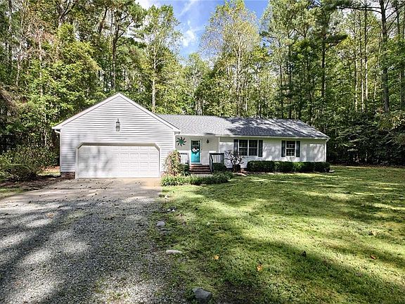5 minutes from Gloucester Courthouse, 1,428 sq ft home is nestled on 5.1 acres in Kings Trace & offers a comfortable split-bedroom layout w/an open, airy design. Great room combines the foyer, kitchen, living, & dining areas to create a welcoming space for everyday living & entertaining. Kitchen features quartz countertops, stainless steel appliances w/gas range, an R/O drinking water filter, pantry, & abundant cabinet space. Living area is highlighted by a cozy gas fireplace, adding warmth & charm. Features: tankless water heater, whole-house water filtration system w/softener, generator plug, & two-car garage w/at ceiling storage shelves. Property also includes a shed w/separate storage area & is wired for electricity. Updates include a new roof/2023, HVAC/2020, water pump/2024, & fresh interior paint in 2024. The crawl space was encapsulated w/dehumidifier in 2019. Cox internet available. Pride of ownership in well-maintained home, country living w/convenient access to town.