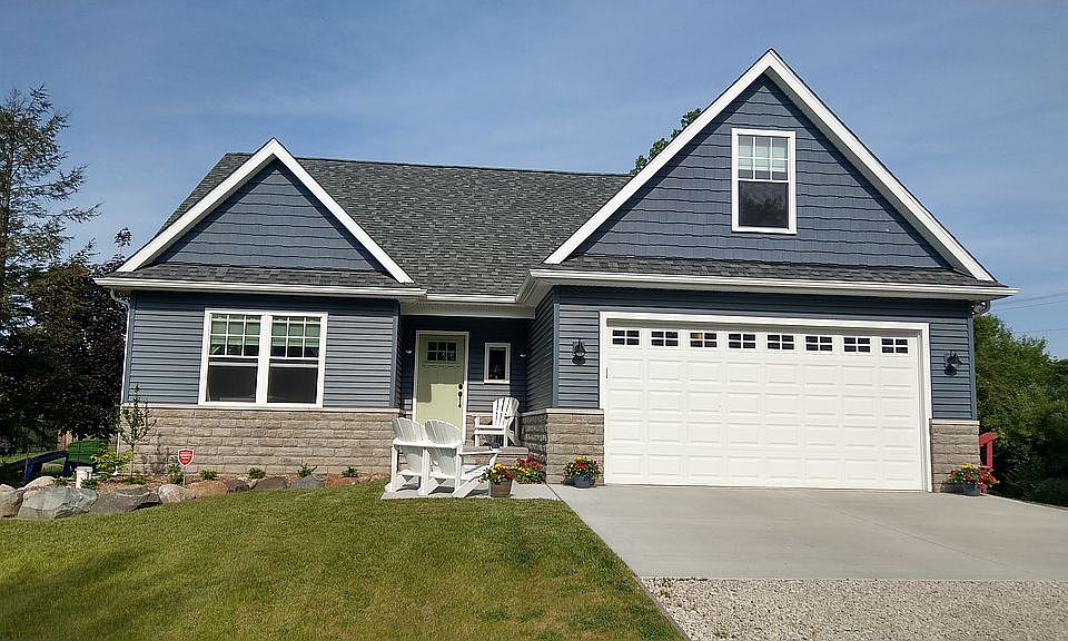 A MUST SEE! Beautiful, pristine home built in 2017. This maintenance-free bungalow is located on a quiet, private, dead end road in the coveted Bruce township/Romeo area. This blue beauty has many amenities including an open concept floor plan, two car garage, hard wood floors, stainless steel appliances, granite countertops and much more. Walking distance to restaurants, stores, parks, and schools all while living in a country setting. This 1,700 sq. ft. house sits on a half acre with water frontage and mature trees. Finished basement includes 1,418 sq. ft. of additional living space. Natural light is at a premium with a wall of windows in the kitchen and an 8 ft. sliding glass doorwall leading out to a maintenance-free concrete patio with beautiful lawn.