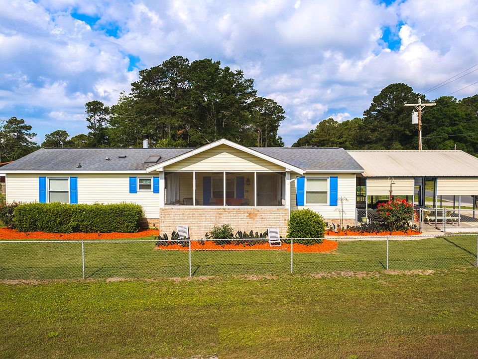 Spacious 3 bedroom, 2 bath home on a corner lot. Home has a fenced in front and back yard with a huge carport with plenty of space to park your boat and several cars. Enter into a foyer that leads to a large dining area. Just off the dining room is a kitchen with white cabinets, stainless steel refrigerator, pantry, gas stove, plenty of counter space and a breakfast nook. Off the kitchen is a light and airy living room with plenty of seating space and a wood burning fireplace to add to the ambiance. On one end of the home is the large primary bedroom with extra bonus area attached. This could be used for a lounge area to relax and/or work at your desk. The en-suite bath has a sink and separate tub and shower. The other two bedrooms are located on the other end affording privacy to all. The backyard has a concrete slab patio area and two story shed. Mostly sheetrock walls. Brick underpinning. Located between Ocean Isle Beach and Sunset Beach, you are very close to either beach; plenty of shopping, restaurants, grocery stores and novelty shops. Make this your very own beach house living.