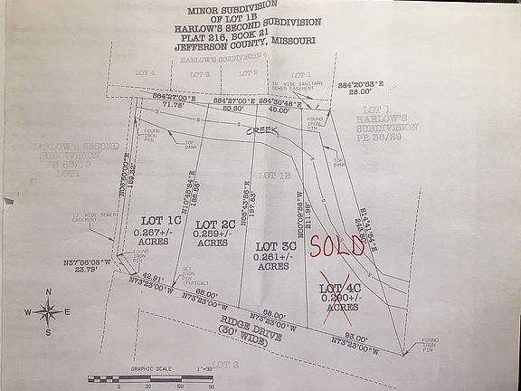 Land - 4 Lots: ¼ Acre Each Located in Barnhart, Mo with Road Frontage. Only 3 lots left of 4 quarter acre lots located in Jefferson County. Close to Interstate 55 for easy on off access to highway. Property is mostly level and wooded with available water, sewer and electric. Survey and engineering done for residential use and zoned no mobile homes. Asking $20,000 for each lot and Lot 1C is addressed as 7098 Ridge Dr. Make Offer