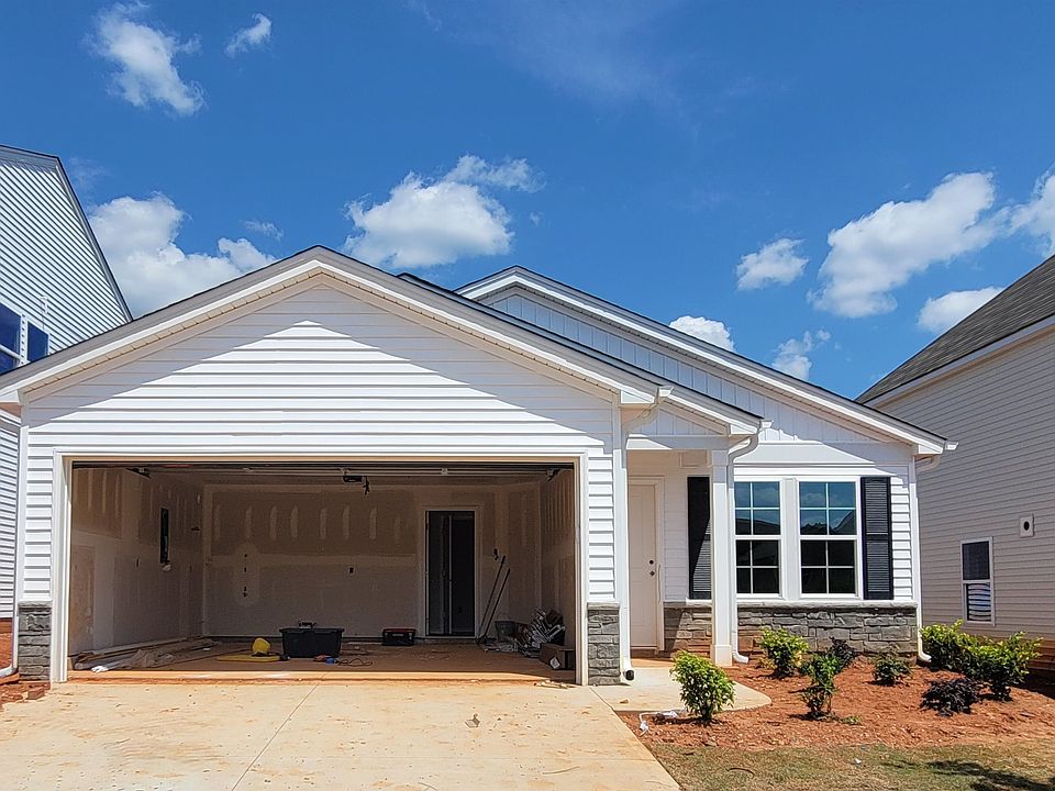 This beautiful floorplan will surprise you once you walk through the front door. The open concept home showcases vaulted ceilings from the entrance to the back door. The beautiful luxury vinyl plank flooring seen throughout the entire home is just one of the designer upgrades in this home. The chef in the family will love the soft gray shaker style cabinets, stainless steel gas appliances and a huge island perfect for entertaining. The family room gives you a glimpse of the covered back porch and a yard that backs to trees. The primary suite will become your retreat with a vaulted ceiling, large walk in closet, a five foot shower, and a quartz countertop. The two secondary bedrooms have nice sized closets as well and are separated by a full bathroom. Stop by Wingate today to see why this home is so special!