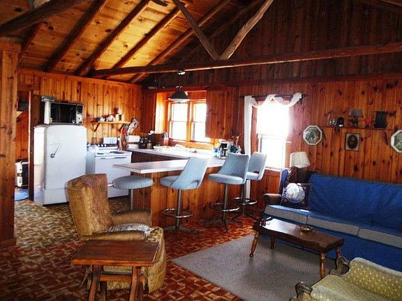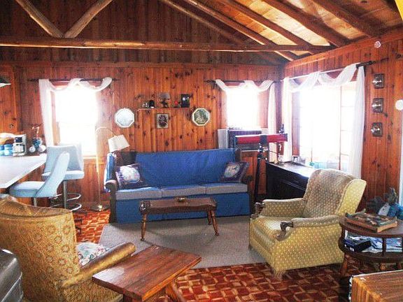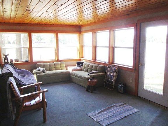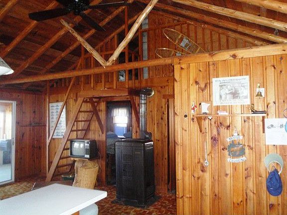 'Up North' cabin situated on the corner of a large lake front lot. Beautiful knotty pine interior with an open ceiling. Loft area above bedrooms. Open floor plan plus a 21'5 x 11'5 +/- sunroom on the lakeside. Oversized 2 car garage built in 2005. One side insulated and drywalled with cabinets for working area. Bonus room above with drop down stairs and an exterior entry. Breathtaking view from cabin and garage. Priced to sell!