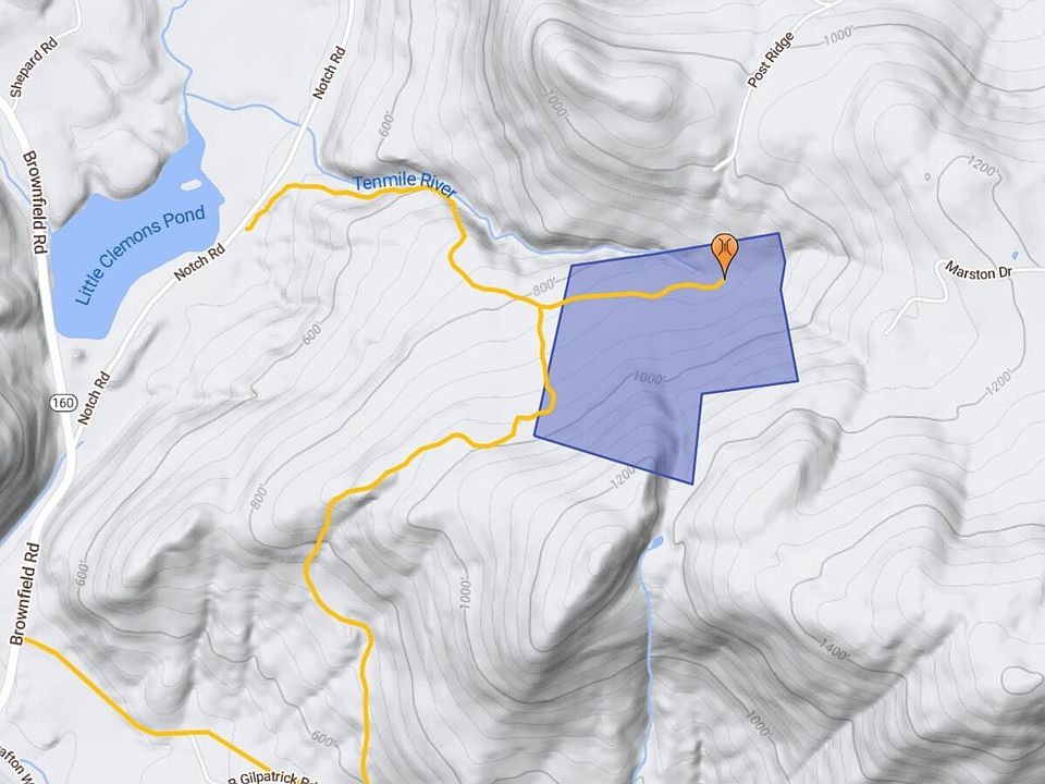 Access off of Ben Gilpatrick Road to this elevated property is currently via ATV, on foot, or horseback. Once there, you'll be treated to an amazing location with views for a hunting camp, or yurt. Aaron Williams Brook does run through the northerly part of this lot on its way to the 10 Mile River and the property hasn't been logged in years and has relatively mature forest. Ben Gilpatrick Road has been a 'town way' since 1852. It is maintained by the town year-round 250 yards from its intersection with Tripptown Road, and is maintained in summer-only by the Town 500 feet from Brownfield Road (Rt 160). The remaining portion between the two town road sections was discontinued in 1955 and the article to vote did not state to retain a public easement. It reverted back to the property owners to the center of the road on each side. Therefore, the condition and maintenance of the road are at the prerogative of the landowner using the road for access. The road is in decent condition a few hundred yards in from the main road. After that, it becomes rougher, suitable for an SUV, truck, or ATV. The road can be improved as desired, with collaboration with other landowners. Turning left onto 'old road' (see survey) the access becomes steeper as it climbs to the southerly property boundary. The subject land has a northerly aspect with the top elevation being a little over 1100ft above sea level.