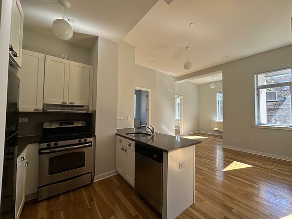 As you step into this Elevated 1st floor apartment, you will notice the high lofty ceilings (12') and open kitchen/living space floor plan. The open kitchen features QUARTZ COUNTERTOPS plenty of storage space, stainless steel appliances, and a large open breakfast bar. The master bedroom will accommodate a queen or KING SIZED BED and features an oversized en suite bath and a HUGE walk-in-closet. The two other bedrooms will fit queen sized beds plus furniture. There are 5 large closets for abundant storage in addition to a closet with washer/dryer hookups. Cooking Gas & water are included in rent.