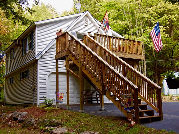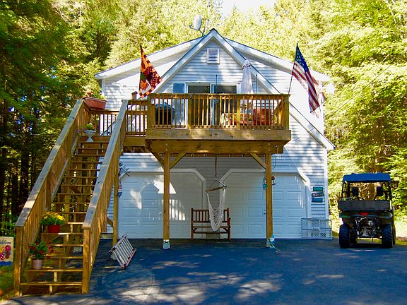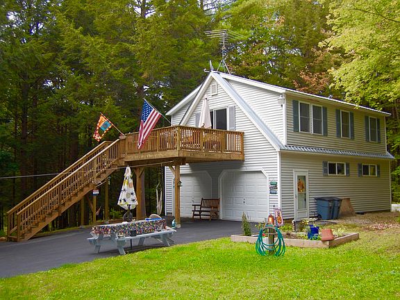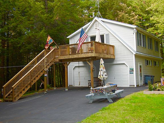Last house on Rocky Lane before the road gives way to woods and wildlife. Very private, very tranquil. Modern, like new main house has 2 bedrooms & 1.5 baths PLUS a separate 16 x 22 bunkhouse with 10 x 20 deck & wood stove to sleep a few more or quite a few more. 50 ft. owned waterfront on David Pond, pristine & well stocked, which flows into neighboring Tilton Pond. 33 ft. dock conveys (bring your party boat). 2 wooded RV sites each offering water, septic, and electricity. Two 8 x 11 sheds, fire pit and functional outhouse, tidy, clean & handy. A 16 x 12 wooden platform sits among the shady trees, ready for your screened gazebo. The main house has maintenance free vinyl, built in AC, a 2 bay attached garage with power doors, a paved driveway and a new 20 x 12 elevated deck 9.5 ft off the ground providing a commanding view... think attached tree house! THIS PROPERTY IS CURRENTLY SET UP AS A SEASONAL PROPERTY. OWNER WINTERIZES EVERY FALL.