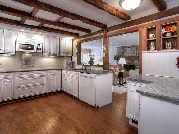 Enchanting antique Colonial w/ many upgrades. LR with gas fireplace and DR with beamed ceiling offer the appeal of yesteryear; large 1st floor master bedrm w/cathedral beamed ceiling and skylights;