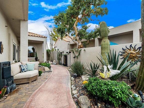 Wake up to lush fairway views and enjoy breathtaking west-facing mountain sunsets from this beautifully updated residence in Mission Hills East, located within the prestigious Mission Hills Country Club. The expanded rear patio serves as a true extension of the living space, offering an inviting outdoor setting ideal for entertaining, sunset gatherings, or relaxing while overlooking the rolling greens and surrounding mountains.A private gated courtyard with mature cacti creates a welcoming desert retreat and leads into a warm, thoughtfully designed interior. The home features wood laminate flooring, a cozy fireplace, and a stylish wet bar, ideal for both everyday living and entertaining. The flexible floor plan offers a spacious living and dining area, two private primary suites, and a third bedroom well-suited for guests or a home office. The kitchen blends function and style with slab granite countertops and newer appliances, including an induction air-fryer/convection oven. Recent upgrades include new windows and sliding doors, recessed lighting, a newer heat pump air conditioning system, duct-work replacement, updated switches and receptacles, and enhanced indoor-outdoor flow that complements the home's resort-style setting.