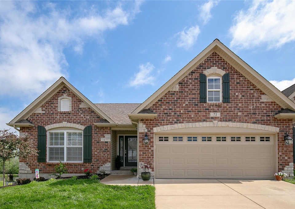 Gorgeous 3 Bedroom, 2.5 bath ranch style Villa with finished walkout lower level overlooking water and open common area! Wide-plank, hand-scraped hardwood flooring graces most of the main level; Open floor plan features vaulted Great Room with gas fireplace & sun room; Kitchen has quartz counters, stainless steel appliances, breakfast bar, 42-inch cabinets with soft close drawers; Main floor laundry; Master suite has tray ceiling, walk-in closet, his/hers vanities & tile flooring in bath; 2nd main floor bedroom with French doors & attached half-bath; Builder finish lower level with huge rec room, large wet bar/kitchenette, 3rd bedroom & second sitting room with double door entry would make a great home office & still plenty of room for storage; Sliding door to patio; Composite deck overlooks pond with fountain; Two-panel doors and plantation shutters throughout; Excellent location near parks, shopping, restaurants; Easy access to Hwy I-44. Enjoy villa style living at its finest
