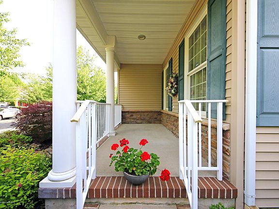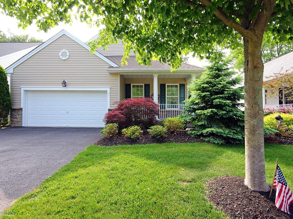 Beautiful expanded Devon model backing up to the woods. Hardwood floors in the living room, dining room, family room and kitchen. Spacious kitchen with granite countertops, tumbled marble backsplash and decorative cabinets with lights. The kitchen opens to the two story family room with gas fireplace. Sliders to deck with awning overlooking the woods. Master bedroom has hardwood floors, tray ceiling and two walk in closets. Master bath has double sinks, soaking tub and shower. Second bedroom with a walk in closet. Full basement, partially finished with cedar closet. Enjoy your resort lifestyle with the outdoor pool, hot tub, bocci and tennis courts. Inside you have a gym, game rooms and community room. Hurry..you still have time to enjoy the summer fun and activities.