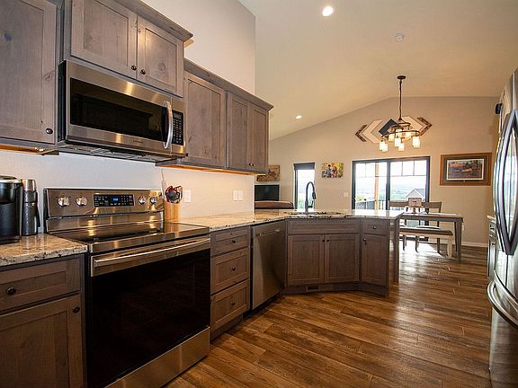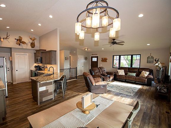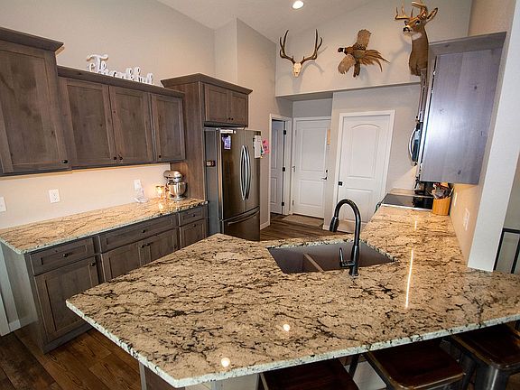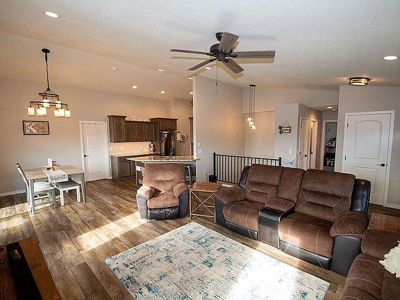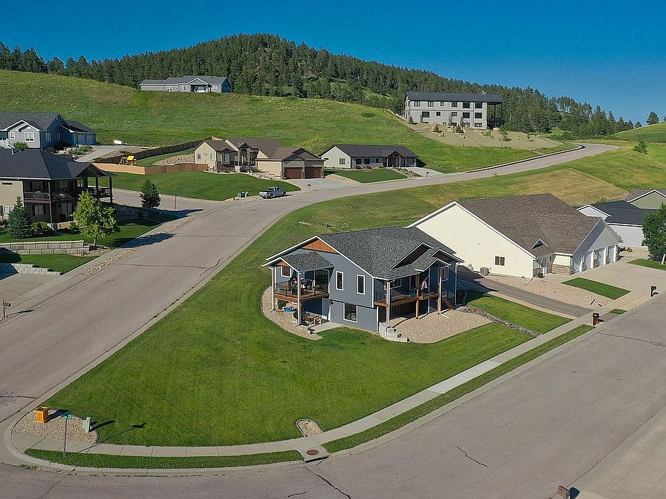 This nearly new 5 bed 3 bath home is located in the quiet Vernon Heights Subdivision providing beautiful views of the Black Hills and overlooking the town of Sturgis. This house includes everything you could wish for in a home from the in-ground sprinkler system to the wet bar located in your walkout basement. The kitchen shines with granite countertops, stainless steel appliances, and a walk-in pantry. Did I mention vaulted ceilings run through the kitchen, living room, master bed, and master bath? You may access your deck, to enjoy the outdoors, from the dining area or your master bedroom. In the master bathroom you will discover a stunning tiled walk-in shower as well as a large walk-in closet. Going downstairs, you will have plenty of room to entertain friends in the large living area with a large custom bar area. Both bedrooms downstairs are large and behind the rustic sliding barn doors you will find walk-in closets as well. Leading up the asphalt driveway you will find a completely finished 2-car garage with a 10' x 8' workshop area. Call 605-569-2760 to schedule a showing before it's too late!