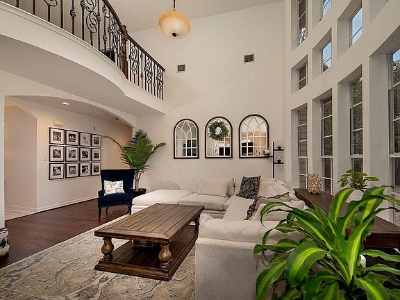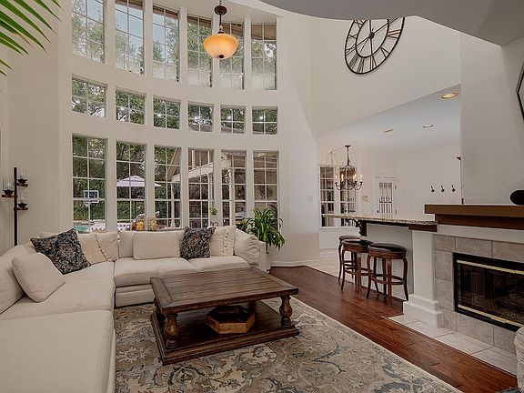 Centrally located LifeForms home on a large, wooded lot in Cochran's Crossing! Dramatic two story entry with sweeping wrought iron staircase, hardwood and tile flooring, designer carpet, and generous room sizes. Open concept island kitchen with granite counters, breakfast bar, stainless steel appliances and plenty of cabinet storage overlooks breakfast room and two story den with gas log fireplace and floor to ceiling windows; elegant formal dining with crown moulding and chair rail; private study with attached powder room; master retreat down with sitting area; three bedrooms and media room up with stage (great for karaoke!); fenced yard provides a park-like setting with sparkling pool and spa enhanced with lighting, outdoor kitchen and covered patio wired for music.