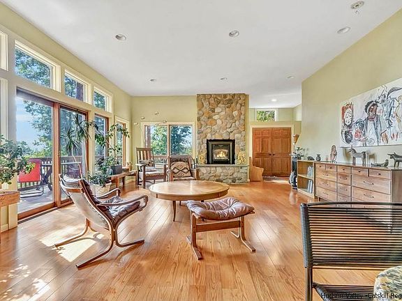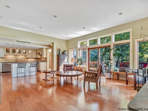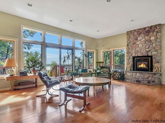 Rustic Contemporary with Ashokan Reservoir Views - Superiorly redesigned bungalow transformed into a beautiful 3 bedroom, 3 bath home at one with its serene surroundings. Set atop a private road with majestic, year-round views, this property is bordered by rock outcroppings, old stone walls and mature landscaping—many of the natural features that make the nexus of the Hudson River Valley and the Catskill Mountains so magical. The house was reimagined and remodeled in 2012 with a large two-story addition, bringing the size to over 3100 square feet. The gourmet kitchen features a 6-burner Wolfe range, brushed nickel appliances, quartz countertops and breakfast bar island open to the living room for family enjoyment and easy entertaining. Most rooms including the living room take full advantage of the south-facing reservoir views with abundant sunshine providing passive heat and warmth. Family and/or guests can feel comfortable and secure in any of the generous three bedrooms, two of which are primary suites with dedicated bathrooms, private decks, and separate entrances. The 2 full baths on the lower level feature marble and Italian terrazzo tiles; one has a granite vanity top and a jacuzzi. Upstairs is a great room with a Birdseye view of it all plus a bonus sleeping nook. Then discover what is tantamount to a studio apartment within the house! Complete with its own full bath, back deck and private entrance, this wing is perfect for live/work scenarios or multigenerational living with maximum privacy all under the same roof. Form meets function with excellent infrastructure including a Generac whole house generator, Majestic wood stove insert, high efficiency Burnham propane boiler (2013) for radiant and baseboard heat, R value insulation/sound-proofing in walls and ceiling, DEP approved septic system, small barn/studio with electric and 12 x 16 shed. Ideal Woodstock address in the middle of all the region has to offer—world class natural beauty, hiking, biking, fishing, skiing, arts, culture and cuisine. Between two entry points to our newest recreational resource, the amazing Ashokan Rail Trail. Around the corner from the Route 28 Gym, Sante Fe Restaurant and Dylan Hotel. This is why we live here. Now you can, too!
