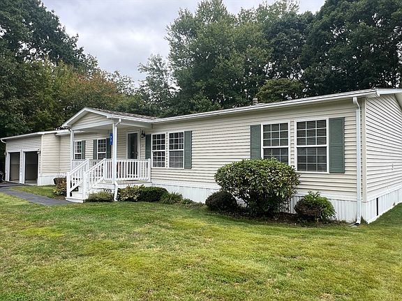 RARE FIND... TWO CAR GARAGE , DOUBLE WIDE MOBILE HOME AT LEISURE WOODS TAUNTON! CONVENIENT LOCATION ! SPACIOUS OPEN FLOOR PLAN! Beautiful double-wide manufactured home located in Leisurewoods 55+ park. Main Bedroom has walk-in closet & private bath with skylight; Large eat-in kitchen with oak cabinets, pantry,closets & laundry closet, massive livingroom / diningroom lead to comfortable 3 season sunroom with sliders leading to private back yard and deck. Large family room leads to 2nd bedroom and full bath with skylight. Central A/C, Irrigation system, and 22x30 2-car garage & a small brook next to house. WOW! Ready for your cosmetic updates !