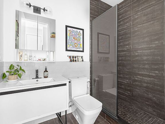 A chic entry foyer with a coat closet opens into the apartment where there is a spacious and serene living/dining room with an oversized window. The chef’s kitchen is tucked away and features stainless steel appliances, including a five-burner Bosch range and microwave, French door refrigerator, and concealed Bosch dishwasher, sleek espresso-stained cabinets, quartz countertops, and tiled backsplash. There is a generously proportioned bedroom with a roomy closet, and the contemporary bathroom features a custom glassed-in shower with a rain shower head, a large vanity, and heated floors for maximum comfort.