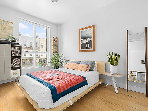 The recently constructed boutique condo sits on a quiet block in the heart of trendy Bushwick conveniently close to the L and J/Z trains as well as plenty of shops, restaurants, cafes, and bars. The pet-friendly building offers a furnished roof deck with sweeping skyline views for relaxation and entertaining.