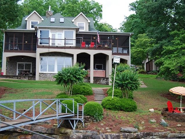 Huge price reduction by motivated seller! This home is an outstanding value at this price. Gorgeous sunset views from this 5BR, 3.5 BA home on Rock Creek. Recently updated with Viking kitchen, open floor plan, hardwood floors and granite counters. Gentle slope, rock shoreline, double slip boat dock with lift. Master BR on main, 2 guest BR upstairs, 2BR, office and rec room downstairs.