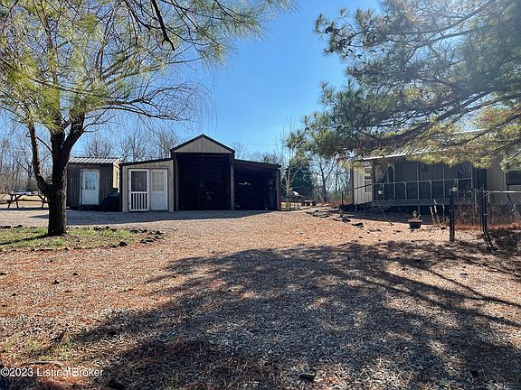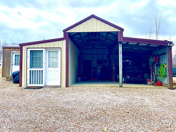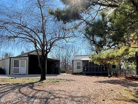 Everyone knows that good things come in small packages & this cozy home in a it's highly sought after location at Rough River Lake is a prime example! While it's only 1 BR & 1 BA, it's loaded with efficiency, comfort & affordability. Having metal siding & a metal roof, it's also relatively low maintenance. The matching 2 bay, detached garage has electric & adds plentiful storage for a boat, fishing gear & other lake life necessities. The addition to the garage has wall units for heat & air so it could be used as a private space for guests. If they prefer to bring their camper or RV, ready for use are the electric & water hookups including a cleanout that connects to the septic system. Inside the home, you'll find the living room that's open to the kitchen with cabinetry accented with an updated backsplash. Off of the kitchen is the bedroom with direct access through the sliding barn door to the full bathroom complete with a step in shower & laundry.
