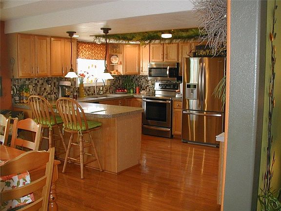 Absolutely gorgeous home ready to move into. Features include new granite counters,3/4 inch wood flooring, formal dining, roomy Rec room with unique barn board walls and large windows, a lovely 3 seasons room with a maintenance free deck attached and another maintenance free deck surrounding a 24X53 above ground pool, attached two stall garage and another detached two stall garage. Appliances stay escept for washer & Dryer but are not warranted. The roof is 4 years old, pool has a new pump and ready for the kids to enjoy. Outdoor fountain also has a new pump. Electrical panel is located behind the flag in the TV room.