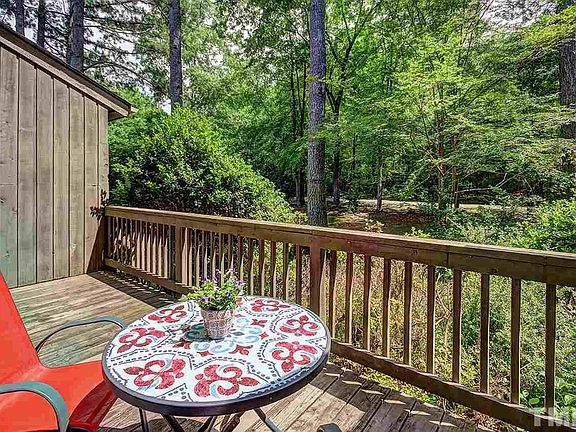 Nestled in nature yet plenty of amenities close by! Covered Front Porch, private Rear Deck. Eat-in Kitchen: Nearly new SS appliances & granite, lots of cabinetry & c'top space; Service entry into separate Dining Area which opens to Living Room w/corner wood-burning FP & glass sliders to Deck w/wooded views. Master BR: 2 closets, lg windows, ensuite BA w/skylight. Two BRs w/fans & lg closets. FullBA w/private WC has tub/shower. Clubhouse, pool, tennis, etc. Short walk & bus line to UNC, Chapel Hill.