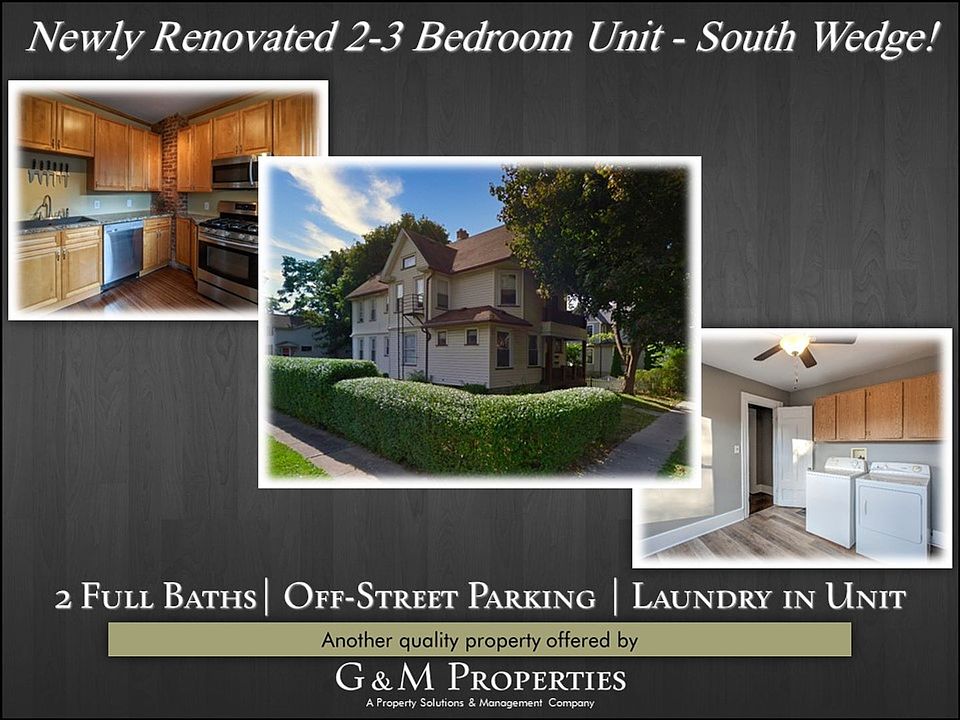 Check out this fantastic, newly-renovated 3-bedroom unit in the fantastic South Wedge neighborhood. You have 3 floors of living space, with a bedroom on each floor. There are two full bathrooms, one each on the first and second floors. The kitchen has been completely renovated, with new appliances, cabinets and gorgeous exposed brick. You'll find beautiful hardwood floors throughout. Upstairs you have a front porch to enjoy the warm summer days. There's a large room upstairs dedicated to laundry, including the washer and dryer for the ultimate convenience. You have your own private entrance in the front, and off-street parking in the back. With a great location that's convenient to everything the South Wedge neighborhood has to offer, this definitely won't last long. Call TODAY for your personal tour of this great apartment! Another fine property that is professionally managed by G & M Properties. You'll love living in this fantastic apartment in this South Wedge neighborhood, with benefits that include 24-hour, 1-call maintenance and online rent payment. Monthly Rent starting at $1,995. Please call for details. **All G&M Properties residents are enrolled in the Resident Benefits Package (RBP) for $30.95/month which includes renters insurance, credit building to help boost your credit score with timely rent payments, $1M Identity Protection, move-in concierge service making utility connection and home service setup a breeze during your move-in, our best-in-class resident rewards program, and much more! More details upon application.** **NO Smoking** **Credit Check / Background Check Required** **Dogs allowed [some restrictions may apply]. Additional Monthly Pet Fee required for dogs with completion of approved pet screening application**