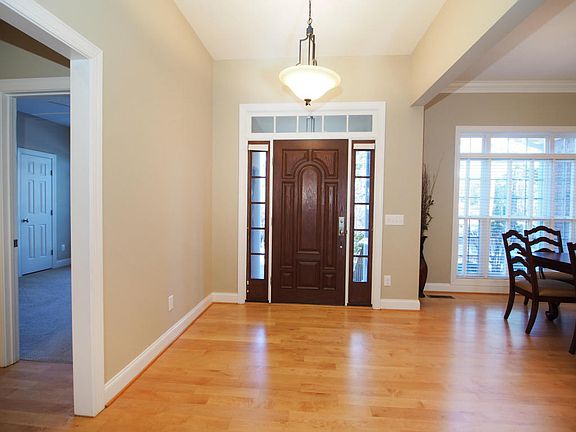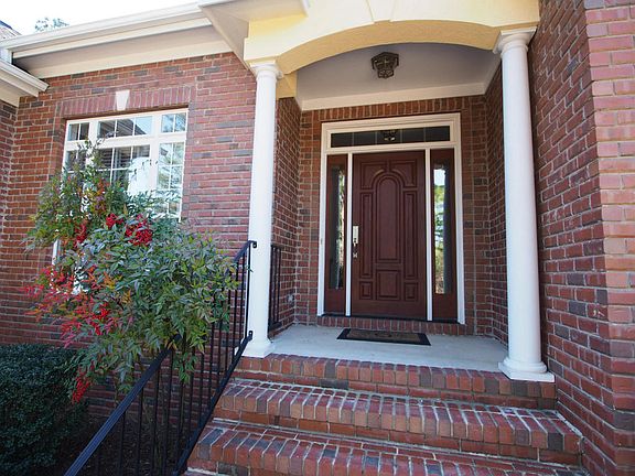 Enjoy front and back golf views from this all brick custom home in the gated community of Pinewild CC. Fabulous open floor plan with split bedroom plan. The living room features hardwood floors, gas log fireplace, double French doors to the back patio, and is open to the formal dining room. The kitchen offers hardwood floors, custom wood cabinets, solid surface countertops, tile backsplash with decorative inserts, and a large pantry cabinet. The master suite features a trey ceiling, recessed lighting and an en suite bath with two walk-in closets. Three additional bedrooms on the main level plus an upstairs bonus room and full bath that would make the perfect office/playroom. Oversized 2 car attached side garage. Priced to sell. Great curb appeal!