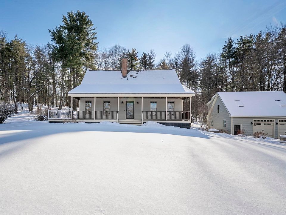 Meticulously maintained Cape w/ large heated garage on 2.86 acres in an idyllic, peaceful, private hilltop setting. Beautiful kitchen featuring soapstone counters & maple cabinets. Great room w/ cathedral ceilings and grand 2 story soft brick chimney w/ Vermont Castings Propane Stove. Large primary bedroom w/ walk in closet and ensuite bathroom with walk in shower and jetted whirlpool tub. Two additional spacious and bright bedrooms along with another full bath offers the flexibility of a 1st floor primary bedroom. Spacious loft overlooking great room provides versatile living space for an office, gym or second living room. Central AC, New Driveway, New 8'x36' Composite Side Deck, Covered 40'x8' Mahogany Farmers Porch Overlooking Field, Buderus Boiler, Well Pump 2019, New Refrigerator. Oil heat w/ 2 oil tanks. Wood stove in basement provides yet an additional source of heat. Heated garage w/ cable. Upper level of garage (approximately 750-800 sq ft) already prepped for future ADU with dedicated 100 Amp Service (200 Amp downstairs), underground water line extension, septic access in foundation, connected to generator, it's own entrance and full dormer in back. 20KV Whole House Generator (powers entire house AND garage) with automatic transfer switch provides year round peace of mind. Home offers endless options whether you desire an adult sanctuary, room for a large family or to have your own farm this property is ready! Front field of approximately 1.5 acres is currently growing hay but was previously both an apple orchard and giant garden. Keep the hay, have a gorgeous grass front yard, add buildings, watch your family and friends play or enjoy seeing your horse graze.....endless opportunities here! Rare opportunity to own a secluded, well equipped, move in ready home that offers versatility all within convenient reach of all town amenities and Pinkerton Academy. Agent interest. OPEN HOUSE Sun 2/1 10am-4pm. Offer deadline Monday 2/2/26 12PM.