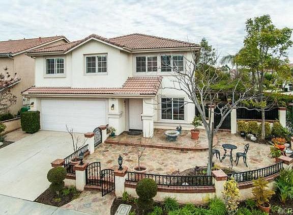 Popular Fieldstone model in highly desirable West Irvine tract. Living room and den are in one big open space with its own sliding glass door that opens to the side yard. Functional kitchen with walk-in pantry & center island, dining area opens into a huge family room with a fireplace and a sliding glass door that opens to backyard. This home features 4 large bedrooms and bathrooms with warm rich tile floors, Master Bathroom has double sink vanity, separate tub & shower w/mirror slider closet door leading to a huge walk-in closet w/organizer. Crown molding and base molding in every room & hallway. Ceiling fans, Plantation shutters, silhouette blinds. Gated front yard with two gate entrances, fountains, front & back yards, paved with flagstone w brick trim, fruit trees & much more.