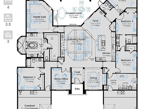 This Rawling Craftsma is a 1-story home with 3,364 sq. ft., 4 bedrooms & 3.5 baths. A formal dining room & home office flank the foyer which opens into a large gathering room, providing direct views onto the covered lanai. A large master suite w/en-suite bath offers a private retreat while secondary bedrooms are on the opposite side of the home. A comfort zone off the nook allows for additional versatility & can be utilized in several ways.