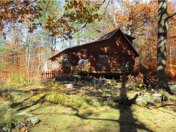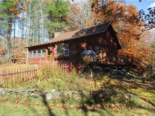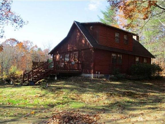 White cedar log home, 32x34 gambrel style 3 stall barn, 60x70 paddock, 18x36 inground pool all sitting on 10 private acres in Gilmanton. Smaller log home design with 2 bedrooms, 1.75 bath, full basement, fireplace with pellet stove insert, kitchen offers open concept to dining and breakfast bar, livingroom with brick fireplace, cathedral ceilings open to 3 season screen porch overlooking gardens; first floor bedroom and full bath; and loft bedroom with 3/4 bath; l10x20 deck to level private lot. Peaceful dirt road located just off Rt 107. Home offers wood or oil furnace for your choice of heat.