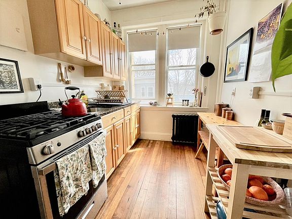 One-bedroom apartment on the third floor overlooking Martin Street and this quiet residential neighborhood of beautiful single-family and well-kept two and three family homes. Very livable floor plan. Foyer can accommodate a small dining area or a study area. French doors invite you into the sunny living room. This unit has three closets. The recently-renovated eat- in kitchen (room for a table and two chairs) has stainless steel gas stove, granite counters, stainless steel sink and faucet. The very convenient laundry room is just down the rear stairs from the kitchen door.